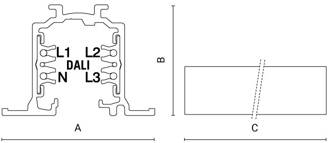 Binario 220V a sospensione, a plafone o a incasso, con circuito tre accensioni DALI, per soluzioni integrate e applicazione di diversi apparecchi.
