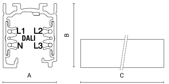 Binario 220V a sospensione, a plafone o a incasso, con circuito tre accensioni DALI, per soluzioni integrate e applicazione di diversi apparecchi.