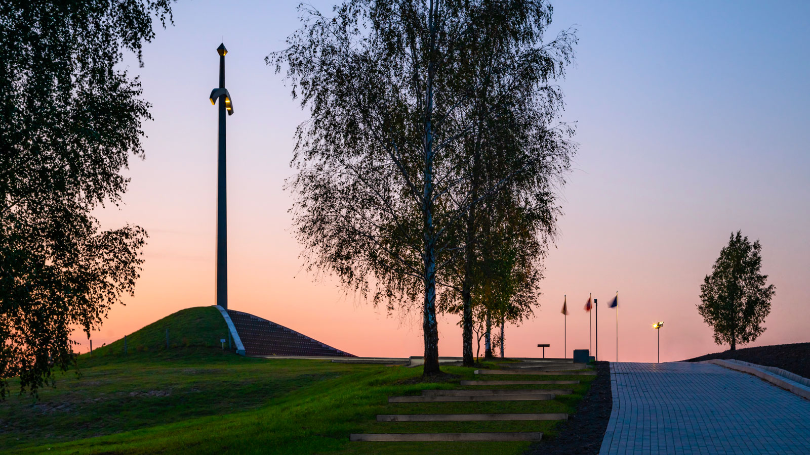 Un'illuminazione scenografica esalta la bellezza struggente del Lithuanian Partisan Memorial a Kryžkalnis